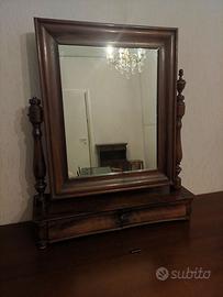 Specchio da tavola d’epoca con cassettino di forma rettangolare racchiuso in una cornice in legno e sostenuto da colonne tornite. Ha una rottura in una colonna. Vedi foto Dimensioni 55 x 18cm h=68cm Solo ritiro a mano zona Milano Sud