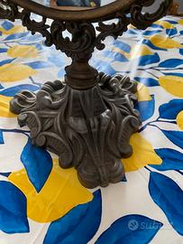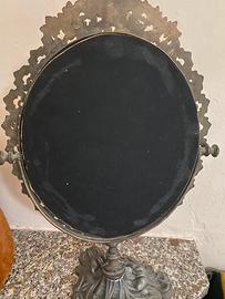 • Dettagli: cornice riccamente decorata, base solida con lavorazioni ornamentali, specchio orientabile tramite perno laterale