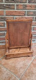trattabile originale Questa è un'antica psiche, uno specchio da tavolo basculante in legno con un cassetto nella base