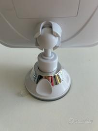 Specchio cosmetico con ingrandimento 10x, con ventosa. Bordo che si illumina, a batteria. Misure interne 13x13, 16x16 col bordo.