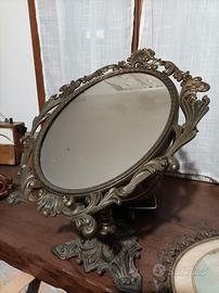 Vendo specchio da tavolo basculante con cornice in ottone stile barocco prima metà del' 900 in buone condizioni, come da foto. misure cm 33xH 51