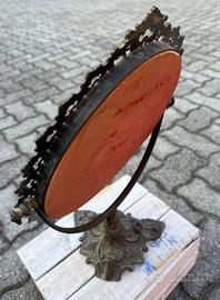 Raffinato specchio da toeletta con cornice e base in metallo decorato finemente inciso.