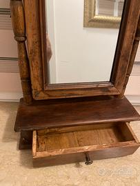 Vendo specchio da toilette d’epoca in legno massello, completo di cassetto inferiore e montanti laterali torniti con specchio inclinabile.
