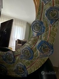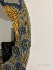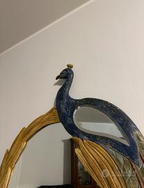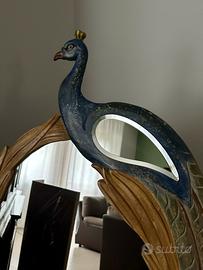La cornice è un capolavoro di artigianato artistico: le piume del pavone, finemente intagliate, avvolgono lo specchio in un gioco di colori vibranti come il blu reale, il verde smeraldo e l'oro zecchino. Grazie alla sua struttura maestosa, non è solo un complemento d'arredo, ma un elemento che amplifica la luce naturale e dona profondità agli spazi.