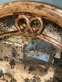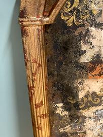 Specchio vintage, superficie anticata con stencil, transfert, cornice rosso Pompei con foglia oro. Oggetto bellissimo, unico e irripetibile, di grande impatto. Misure 90x60
