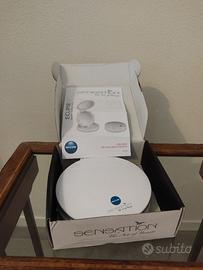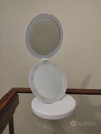 Specchio ECLIPSE marca Macon da tavolo, doppio bifocale pieghevole con luci LED. Usato poco e in ottime condizioni, con le istruzioni e la sua scatola (che come da foto ha un piccolo danno in un angolo). Funziona con 4 batterie AAA. Diametro 16 cm