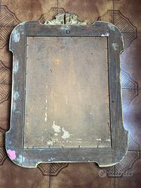 Specchio antico con cornice dorata in legno massello intagliato, risalente alla seconda metà dell’Ottocento. Lo stile richiama il Luigi Filippo o il Neobarocco, con forme morbide, decori floreali e doratura a foglia oro.