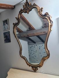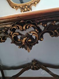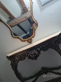 Specchio con cornice lavorata rifinita foglia d oro , bello. Abbinato a consolle stessa lavorazione, con piano marmo rosa fior di pesco eventualmente da rilucidare. Possibilità di consegna a domicilio, concordand spesa e se zoone limitrofe.