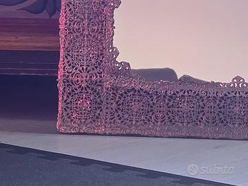 Questo specchio rettangolare si distingue per la sua cornice in metallo finemente lavorata a filigrana, un dettaglio che richiama immediatamente le atmosfere e le trame degli arredi orientali. La ricchezza del traforo lo rende un pezzo di design ideale per valorizzare ambienti dal gusto etnico o arabeggiante, dove la luce può giocare con i vuoti e i pieni del metallo. Con dimensioni di 45 x 52 cm, è un complemento d'arredo versatile e di grande impatto visivo. La struttura è solida e dotata di due agganci originali saldati sul retro per un fissaggio sicuro a parete. La superficie specchiante è ben conservata e si integra perfettamente nella cornice, creando un oggetto che è al tempo stesso funzionale e decorativo. Perfetto per chi cerca un dettaglio ricercato per l'ingresso o la zona giorno, si presta ottimamente anche come idea regalo di carattere. L'oggetto è visionabile e disponibile per il ritiro a mano a Reggio Emilia