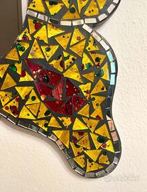 Bellissimo specchio da parete a forma di farfalla, realizzato con tessere di mosaico e vetro che creano splendidi riflessi di luce. Al centro è presente uno specchio rotondo, elegante e ben integrato nel design. Ideale per dare un tocco originale a ingresso, camera o soggiorno. Perfetto per arredamenti creativi, boho o moderni. Dimensioni: Larghezza max: 56 cm Altezza max: 60 cm • Condizioni: come nuovo
