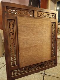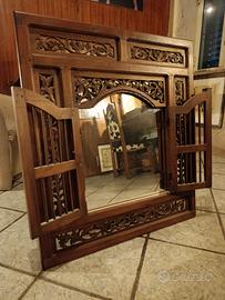 Splendido specchio a finestra "Jendela" originale, realizzato artigianalmente in Indonesia. Il telaio è interamente in legno massello finemente intagliato con motivi floreali e fogliame.