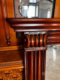 - Cornice Dettagliata e Intagliata: La cornice presenta elaborate lavorazioni e intagli. Ai lati, eleganti colonne con scanalature verticali (stile fluted) aggiungono un tocco architettonico. I bordi esterni hanno modanature complesse e stratificate, che creano un effetto visivo di profondità e ricchezza.