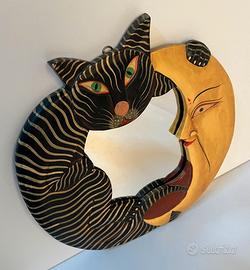 Bellissimo specchio decorativo a muro, realizzato in legno intagliato e dipinto a mano.L'opera raffigura un motivo stilizzato di un gatto a strisce nere e giallo/crema con grandi occhi verdi che abbraccia una meravigliosa luna gialla. Il design è dinamico, con le due figure che si congiungono formando un cerchio perfetto, simbolo di unione ed eternità.