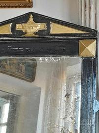 specchio in stile impero di dimensioni medie, circa 1950, rivisitato in stile art déco impero oro e nero con timpano in stile impero, frontone greco in cima, borchie dipinte d'oro, retro verde originale del 1950. Lo specchio è naturalmente macchiato con piccole pagliuzze oro, usura originale. Donerà un tocco di elegante sofisticatezza a qualsiasi stanza o stile di design; grazie alle sue dimensioni particolari, può essere facilmente posizionato su un mobile del bagno principale, su un comodino della camera da letto, nell'ingresso o semplicemente appoggiato su una consolle tra vasi greci e tesori di antiche rovine. Illuminerebbe la tua statua bianca preferita se usato come sfondo classico.