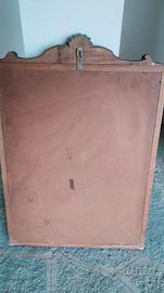 La cornice è realizzata in legno con una cimasa decorativa superiore finemente lavorata, che dona carattere e importanza all'oggetto senza risultare eccessiva.