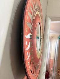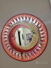Splendido specchio da parete rotondo, con un affascinante motivo di sole e luna. La cornice è realizzata in legno con dettagli in mosaico di vetro, che gli conferiscono un distintivo stile etnico e chic, perfetto per aggiungere un tocco vintage alla tua casa.