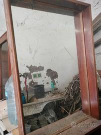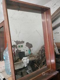 Specchio di gradi dimensioni di fattura artigianale in noce, con scaffalatura laterale realizzato come specchiera sopra mobile bagno. Il mobile appare impolverato perché conservato in una cantina, ma è integro e ben rifinito. Nelle foto appare in verticale, perché così è stato conservato, ma la posizione corretta è quella orizzontale.