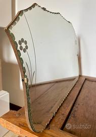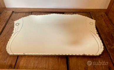 Un pezzo vintage stupendo! Specchio inglese, con decorazioni sui lati e bordo smerlato. misure larghezza massima 52 - altezza massima 33. Con parte dietro in legno e catena per appenderlo.