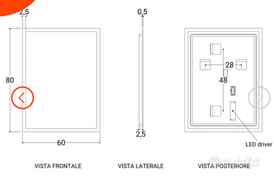 Vendo specchio led con cornice luminosa (luce fredda 1470 lm), misure 60x80cm, reversibile (orizzontale/verticale), spessore 2,5 cm. Accensione con interruttore domestico, inclusi i fissaggi a muro. Specchiera ancora imballata, mai aperta. Vendo per acquisto errato.