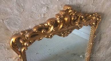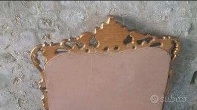 lSPECCHIO IN LEGNO INTAGLIATO E DORATO CON CIMASA IN STILE BAROCCO, ANNI '50/60 DEL NOVECENTO.