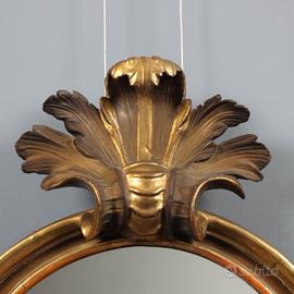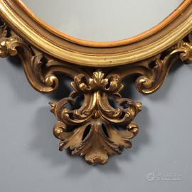 Specchiera ovale in legno intagliato, dorato e laccato. Cornice modanata con