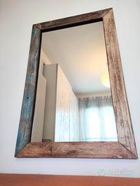 specchio con cornice in legno, produzione unica artigianale, finitura shabby colore blu decapato su legno.