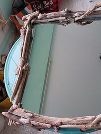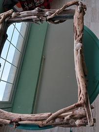 specchio con cornice realizzata in legni di mare e conchiglie "arca di noe" colore tono su tono. pezzo unico. misura cm 50x60 circa