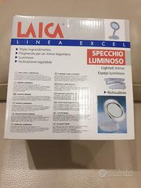 Nuovo. Mai utilizzato ancora nella scatola. Specchio luminoso, marca Laica con braccio pieghevole, triplo ingrandimento. Si può usare sia con le batterie che con l'alimentatore, sistema più economico e ecologico. Richiudibile, inclinazione e altezza regolabili. Utile anche per i viaggi e nella vita di tutti i giorni. Per il trucco, mettere le lenti a contatto ecc tanti altri usi.