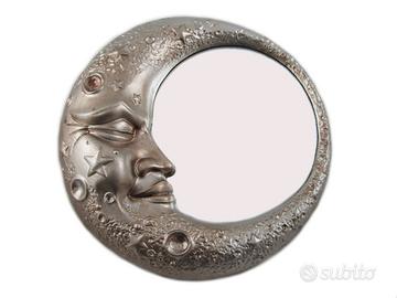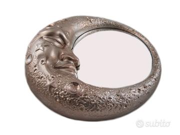 Specchio argentato finto vintage in stile barocco raffigurante la luna, interamente realizzato in plastica di riciclo. La forma è sagomata e in rilievo e ha un gancio posteriore per poterlo fissare alla parete. Simpatico complemento da arredo per chi possiede una casa in stile, per arredare simpaticamente e con eleganza una parete o un ingresso senza spendere una fortuna. Dimensioni: Massima estensione cornice 32 cm - Dimensioni specchio 22 x 19 cm