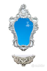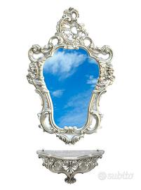 Set composto da specchio più consolle finto vintage in stile barocco Luigi XVI, interamente realizzato in resina sintetica con plastica di riciclo.