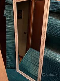 Specchio nuovo, mai usato, in perfette condizioni a figura intera stile barocco francese, con cornice bianca decorata. Perfetto per camera da letto, cabina armadio, ingresso o salotto. Utilizzabile sia appoggiato a terra che fissato a parete. Misure: 80x190cm Pagato 150€, vendo a meno di metà prezzo. Da ritirare a Trieste - piano terra.