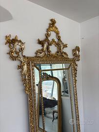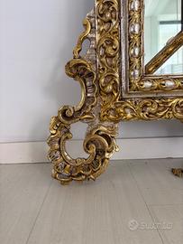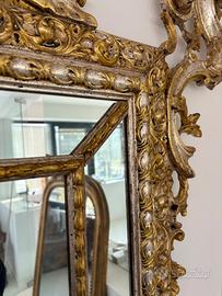 Specchio oro, argento e mecca, fine '900. Necessita piccolo restauro nel fregio inferiore (come da foto).