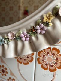 Vendo uno meraviglioso specchio da parete ovale in ceramica smaltata italiana la Farnesiana Parma, caratterizzato da un bordo ondulato bianco con delicato motivo floreale.