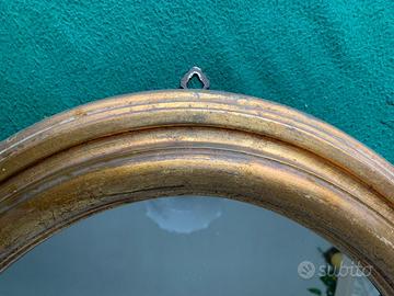 Specchio ovale vintage in resina dorata.