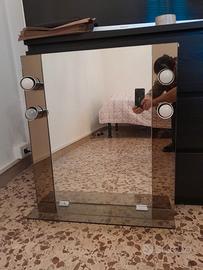 Specchio per bagno, nei bordi laterali ambrati sono inserite 4 lampade per illuminare bene l'immagine riflessa. Alla base c'è una mensola sempre in vetro ambrato. Altezza cm 73, larghezza cm 63.