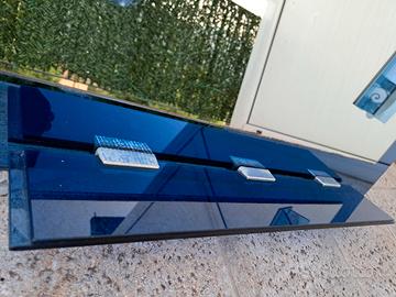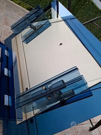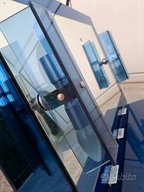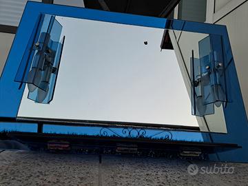 Specchio per bagno vintage, colore blu, due applique luce e mensolina in vetro. Necessario rifare collegamento elettrico, piccola macchia sul vetro, sbeccature negli angoli inferiori