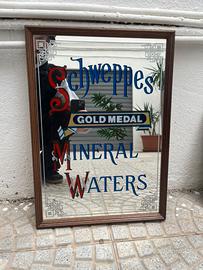 Uno splendido specchio pubblicitario originale Schweppes “Gold Medal Mineral Waters”, con cornice in legno e decorazioni serigrafate sul vetro.