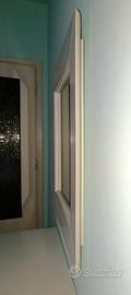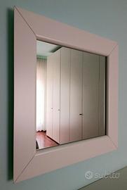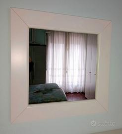 Specchio quadrato per camera da letto in larga cornice bianca di legno. Dimensioni massime esterne cornice cm 80 x 80 x 3,8 / Dimensione netta dello specchio cm 56 x 56. Eccellente stato di conservazione; come nuovo.