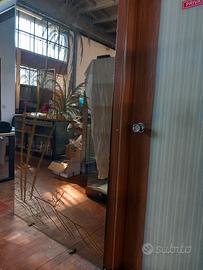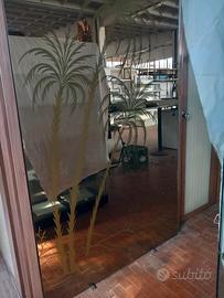 specchio da parete senza cornice, serigrafato con motivo di palme, misura cm 214 altezza x cm 121 larghezza. presenta una piccola scalfittura nell'angolo inferiore destro
