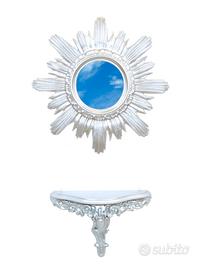 Set composto da specchio raffigurante il sole più consolle, finto vintage in stile barocco Luigi XVI, interamente realizzati in resina sintetica con plastica di riciclo.