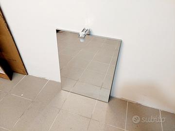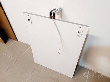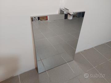 Bellissima Specchiera ideale per bagno ma anche per altri utilizzi , misura 52 x 68 cm , spessore circa 3 cm , luce a led 220v centrale con sostegno cromato , asole posteriori per appenderlo.
