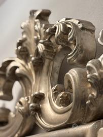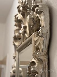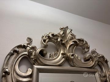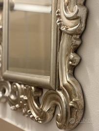 Splendido specchio in stile barocco rettangolare in foglia d’argento e champagne.