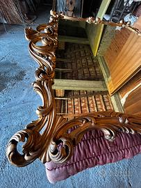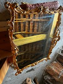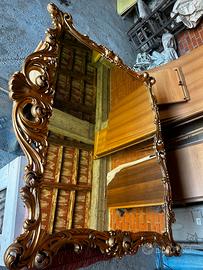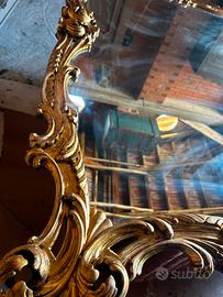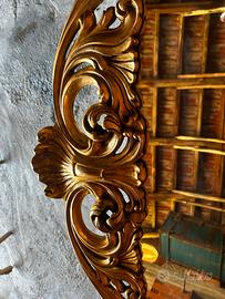Splendido specchio da parete in stile barocco con raffinata cornice in legno dorato finemente intagliata. Un complemento d’arredo di forte impatto estetico, ideale per valorizzare ingresso, soggiorno, camera da letto, negozio o B&B. Perfetto sia in ambienti classici che moderni per creare un effetto elegante e ricercato. Lo specchio dona luminosità e profondità agli spazi. ✔ Cornice decorata artigianale ✔ Grande presenza scenica ✔ Ideale anche come elemento d’arredo vintage/chic ✔ Buone condizioni generali Visionabile senza impegno. Dimensioni: 135x158 cm