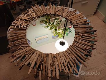specchio tondo con intorno raggio di legni marini portati dal mare più stelle e conchiglie. diam. cm 70. costo dell'imballo aggiunto per evitare la rottura.