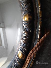 Vecchio specchio di bella manifattura e giuste dimensioni, in buone condizioni (qualche piccola mancanza nel decoro che ne valorizza la patina) di ampio utilizzo (per esempio come arredo di un bagno elegante) Provvisto di cordini per appenderlo. Diametro circa 60 cm.