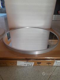 Specchio rotondo da parete con una cornice in alluminio satinato spazzolato.