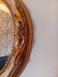 specchio ovale in legno dipinto a mano, in perfette condizioni, appendibile sia in verticale che orizzontale, misure 81x62.