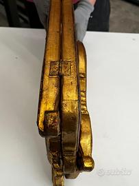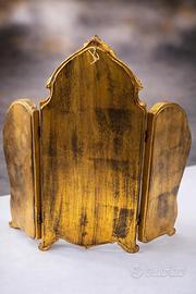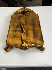 Specchiera da tavolo tripartita stile Rococò – dorata Elegante specchiera da tavolo a tre ante, in legno intagliato e dorato, realizzata in raffinato stile Rococò (Luigi XV). Un oggetto decorativo di grande fascino, perfetto per impreziosire una camera da letto, una consolle o un angolo trucco. - Struttura in legno - intagli con motivi floreali e volute - Doratura con patina vissuta - Tre specchi orientabili -Richiudibile Ideale come specchio da toeletta o elemento scenografico per arredamenti classici. Condizioni buone, con normali segni del tempo che ne valorizzano il carattere vintage. Possibilità di ritiro a mano a Modena o spedizione.