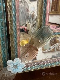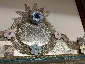 Vendo splendido specchio veneziano in vetro di Murano, finemente lavorato con incisioni floreali e applicazioni in vetro color pastello.