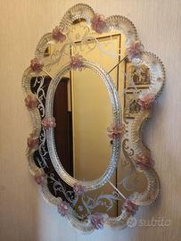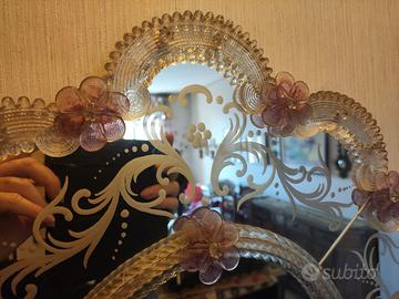 Specchio veneziano in vetro di Murano composto da cornice in vetro con decorazioni floreali ed incisioni. Dimensioni 70x50cm Solo ritiro a mano zona Milano Sud